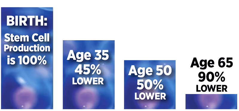 By age 65, your stem cells are down 90%. THE RESULT is that you don’t heal as fast, or as well. Fortunately, we now know how to increase your stem cell supply as you grow older.